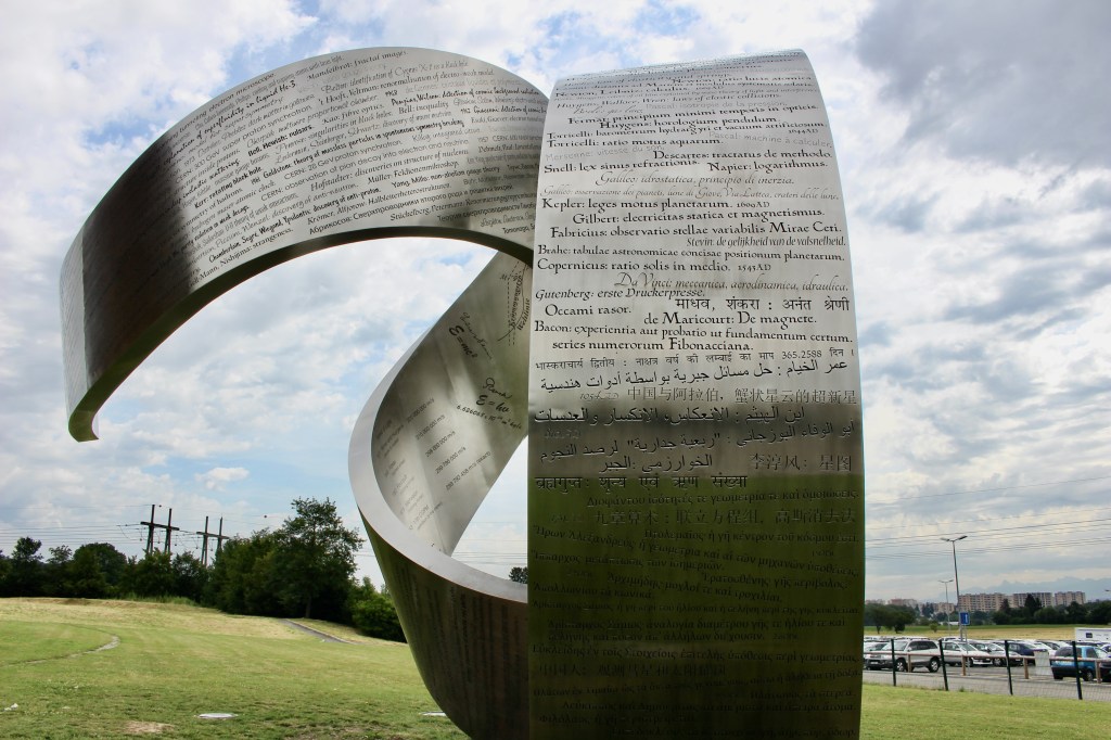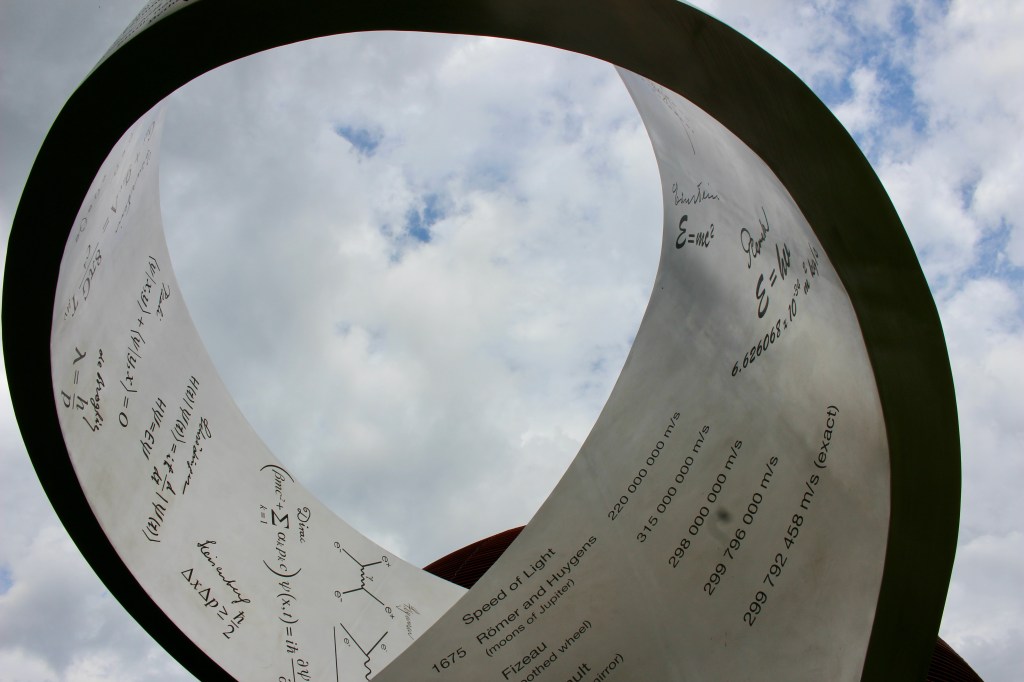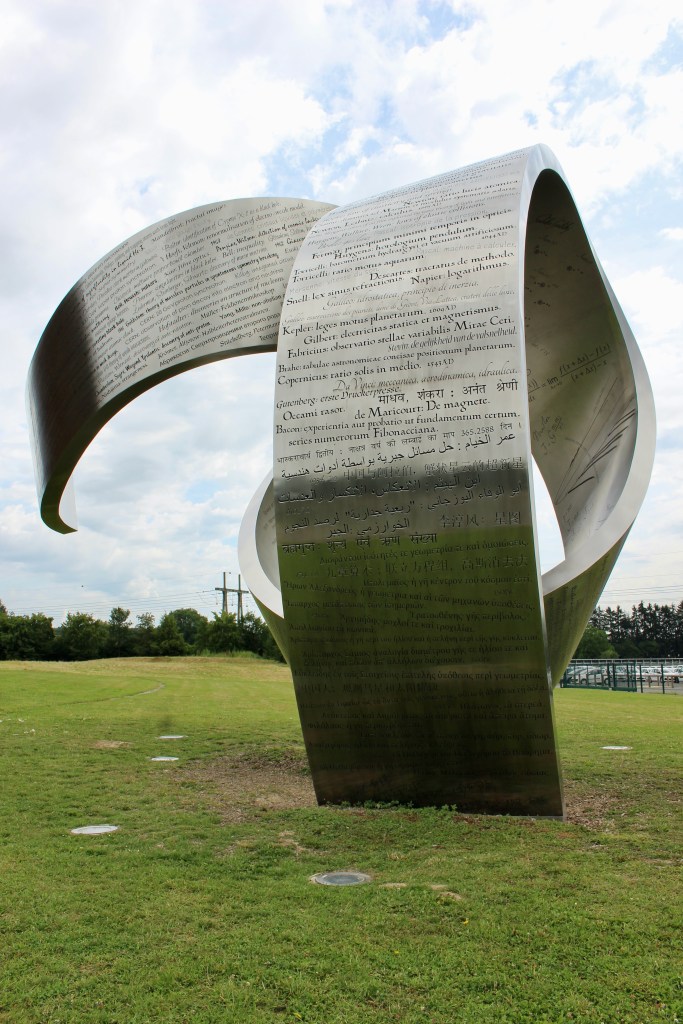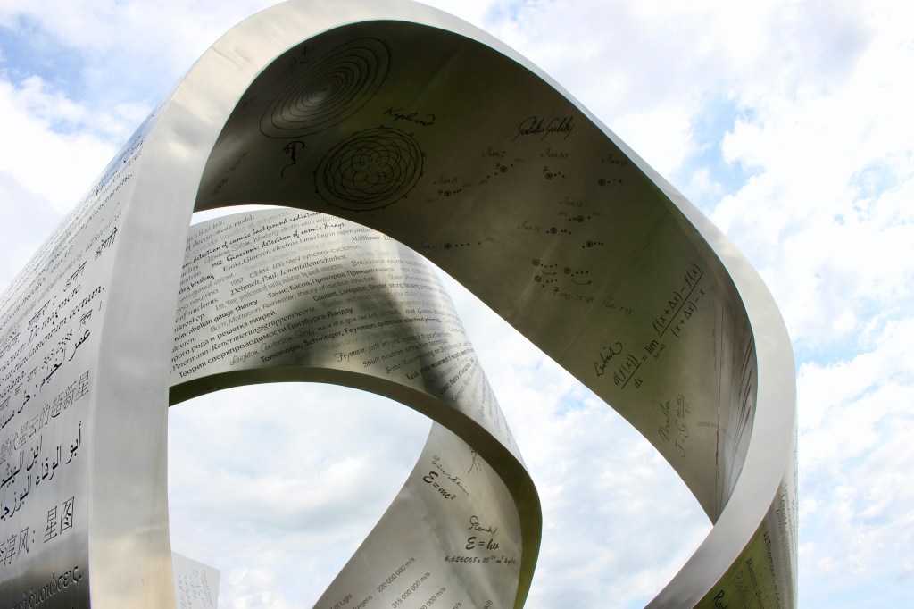 In 2014, a 15-tonne steel sculpture was erected on the lawn in front of the Globe. It’s a 36′ (11 m) tall sculpture shaped like a giant ribbon twisting through space called “Wandering the immeasurable.” It is laser-etched with almost 400 discoveries made over thousands of years. Each represents a breakthrough in the fields of mathematics and physics. The inscriptions are written in the discoverer’s language of origin. I spent what felt like hours reveling in the feeling that I was part of something much bigger than myself. I was part of a history of human curiosity that continues today. I was thrilled to find out that the sculpture was designed by a Canadian artist named Gayle Hermick. Go Canada!